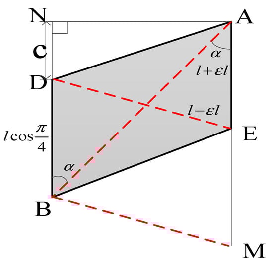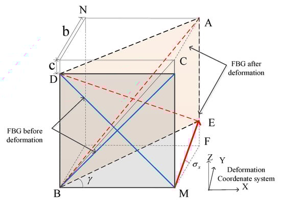 In the diagram, the deformation angle is the shear strain. The length of the FBG sensor before deformation is calculated, and the geometry of the plane ADBE is extracted as follows: