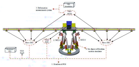 The wing deformation test and verification system based on FBG is composed of a simulated wing structure, the FBG deformation measurement system, the DPOS, and six degree of freedom motion simulator. The simulation wing junction contains 10 sub-nodes on the left and right sides, and the whole wing structure is fixed by the mounting base. It is fixed on the six degree of freedom motion simulator, and the six degree of freedom motion simulator could simulate the typical motion environment of the aircraft, which includes the typical line motion and angular motion. The FBG deformation measurement system is composed of FBG sensors and a demodulator, in which the FBG sensor is installed on the upper surface and lower surface of the simulated wing structure. The surface corresponding position information is used to measure the wing deformation. The main IMU is mounted on the base of the analog wing structure, and the 10 sub-IMU are installed on the left and right side of the simulated wing structure, respectively. A schematic diagram of the system composition and installation is shown in Figure 9.