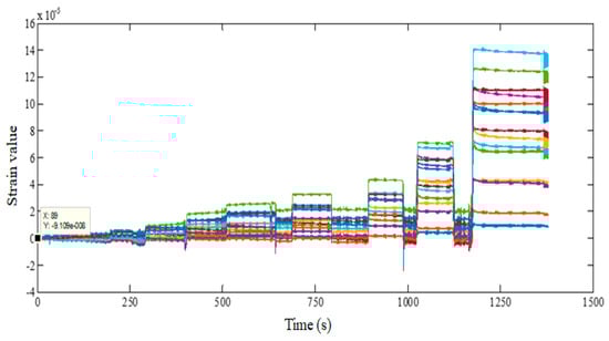 The wavelength data measured by FBG sensors on the upper and lower surface as well as the strain values of the measured points of the FBG sensors are calculated after the difference. Figure 13 shows the strain on the 15 measuring points of the flexible wing changed with time.