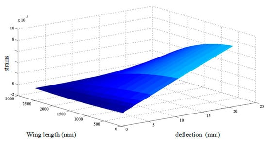 According to the force condition of the flexible wing, the strain value is fitted two times. Figure 14 shows that the X-axis and the Y-axis are the end displacement values of the wing and the Z-axis is the strain value at each load weight.