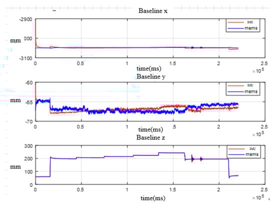 First of all, the main system-based laser gyros and subsystem based on MEMS gyros conduct transfer alignment according to position and attitude matching method above, and obtain the attitude of the subsystem and the flexible baseline length of three dimension; second, the main system and the high-precision subsystem based on fiber gyros also conduct transfer alignment to obtain the attitude of the subsystem and the flexible baseline length of three dimensions. Finally, the two transfer alignment results are compared to verify the accuracy of transfer alignment. In the process, MEMS IMU and fiber IMU are rigidly connected at the end of the simulated wing. The comparison of the processed attitude results is shown in Figure 18 and Figure 19. The results from the fiber IMU are used as the reference, and the error statistics for attitude and baseline length are shown in Table 4 and Table 5.