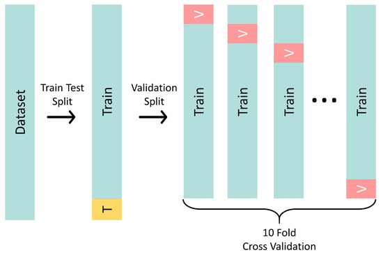 Even knowing that cross-validation is a standard way of evaluating learners, it is not immune to downsides. Running many configurations of algorithms on the same dataset for cross-validation can produce good results by chance [39], so in this paper, we also implemented a step of testing in our algorithm to see how it behaved when compared to the cross-validated results. When an algorithm achieves a satisfactory result in training and a poor result in testing, this is a phenomenon called overfitting [40], and the structure of cross-validation plus testing aims to avoid or at least identify this problem. The testing of the algorithm used the fraction of the dataset marked with a capital “T” in Figure 2.