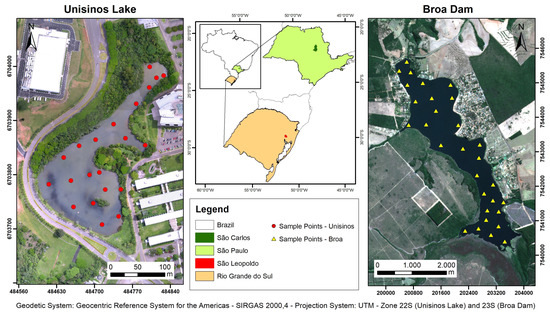 Aiming to validate the proposed approach, two water bodies in different regions of Brazil were visited to extract information about water quality. The regions differed in the type, size, usage, and climate conditions. One of the areas was a small artificial lake located at Unisinos University, in São Leopoldo city, Rio Grande do Sul state, in the south of the country. The other area was Broa’s Reservoir, a dam located in Itirapina city, São Paulo state, in the southeast of the country. Figure 3 shows the location map of the study areas.
