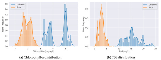 The Unisinos Lake collections were made in two consecutive years (2016 and 2017), and although they were at the same time of the year (March), the climatic conditions of the period were different. This bimodal distribution of chlorophyll-a indicated that this parameter was more present in one year than in the next. Furthermore, Unisinos data had more variance, whereas Broa’s were more concentrated around the mean value. Regarding TSS, Unisinos’ distribution was also widespread, but there was no sign of bimodal behavior; see Figure 4b).