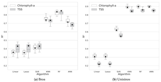 Beyond visual inspection of Figure 5, Friedman tests [47] were performed on the cross-validation results for the KNN, RF, and ANN algorithms. The statistical tests were run on all four combinations of the study case/studied variable: Broa-chlorophyll-a, Broa-TSS, Unisinos-chlorophyll-a, and Unisinos-TSS. In each of these cases, the results for K-fold cross-validation of the algorithms KNN, RF, and ANN were considered in the statistical test. For Broa, the null hypothesis was rejected in both cases, with and for chlorophyll-a and TSS, respectively. Usually, a post-hoc test is necessary to identify which algorithm is better, but in this specific case, by inspecting Figure 5a, it is trivial to indicate that in this specific scenario, RF outperformed the other algorithms. For the Unisinos study case, the null hypothesis could not be rejected, , and for chlorophyll-a and TSS, respectively. No significant difference between the algorithms was detected in this particular study.
