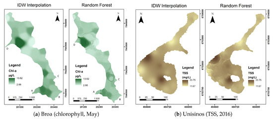 We applied the RF algorithms to all processed images of the study areas in order to observe whether the predicted maps generated for each variable presented a spatial distribution consistent with the expected result (maps with sampling data interpolated). Figure 6 shows two examples of this comparison, one for Broa considering the parameter chlorophyll-a and the collection for May 2018 and another for Unisinos with TSS and the collection for the year 2016.