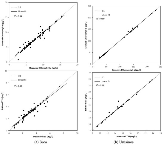 The results achieved for both TSS and chlorophyll-a predictions reached a higher coefficient than research studies for the same region [20,27,48], as well as other similar studies over different areas [1,26]. Since the two studied regions present different environmental characteristics, these results indicated the soundness of the proposed method for water quality monitoring through remote sensing and ML techniques.