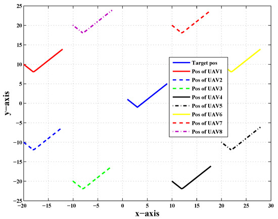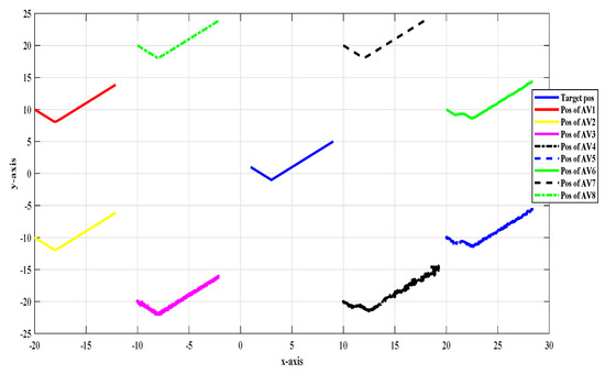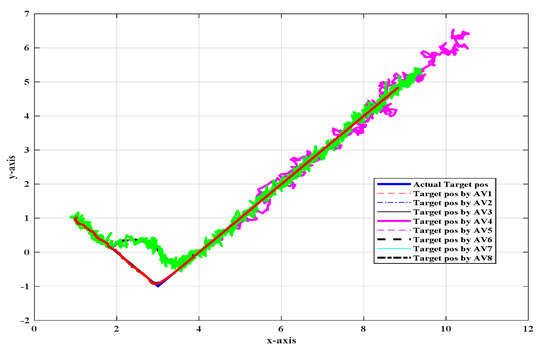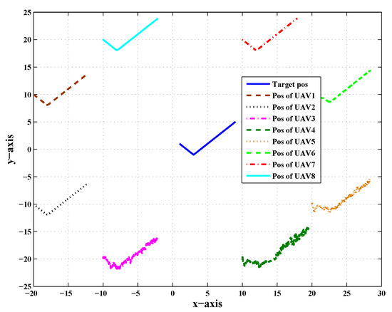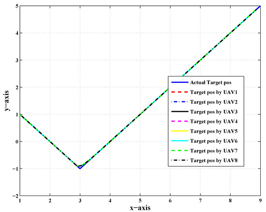 Figure 1 shows the top view of the target tracking scenario in which all UAVs were tracking the target efficiently in the absence of noise and fault, while Figure 2 shows the combined trajectories of the target and eight followers without fault and noise; the path followed by the target and its position estimated by each UAV are shown, which guaranteed that the track estimated by each UAV in the noise-free environment was acceptable.