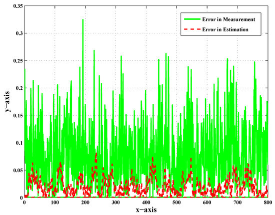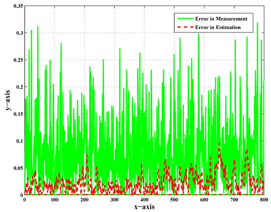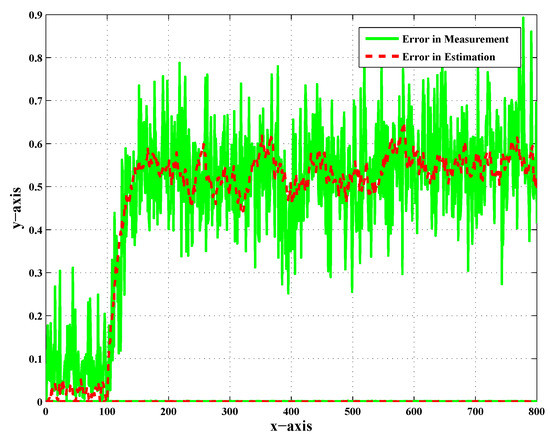 Figure 7, Figure 8 and Figure 9 show the error in measurement and also the error in the estimation of UAV-3, UAV-4, and UAV-5 in particular. These error plots present the deviation of measurement and estimation in meters (m). Figure 9 presents the error in measurement and estimation; it is clear from the figure that the error in measurement showed more deviation from the actual value as compared to the error in the estimation. In addition to that, this was observed as the worst case scenario for faults and noise. A sufficient change in the percentage of error was observed after employing the scheme.