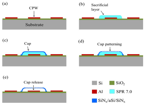 Figure 1 shows a sketch of the process flow for the fabrication of the thin film encapsulating caps. All samples were fabricated on 3 in, ISO standard silicon wafers, covered with 500-nm thick silicon oxide. A 450-nm thick aluminum layer was deposited at room temperature by RF sputtering and patterned by optical lithography and lift-off techniques to define CPWs (Figure 1a). The positive resist SPR7.0 was used with a thickness of 8.5 μm as the sacrificial layer to define the air gap areas under caps on the central conductor of CPWs (Figure 1b). Thin films in the trilayer SiNx/a-Si/SiNx with thicknesses of 220/350/227 nm respectively, were deposited in a single process using a coupled planar parallel electrode Multiplex Series PECVD (Surface Technology Systems, Ltd) with an electrode diameter of 24 cm (Figure 1c). The system was equipped with a high frequency (HF) generator at 13.56 MHz and a low frequency (LF) generator at 380 kHz. The operating temperature of the shower head of the machine was 200 °C, while the temperature of the chuck where the wafer was placed during the deposition process was 150 °C. The other parameters for nitride depositions were: 40 sccm of NH3, 40 sccm of SiH4, 1960 sccm of N2, chamber pressure of 900 mTorr, HF generator power of 30 W, LF generator power of 20 W, HF/LF cycle time of 8 s/2 s. The parameters for the deposition of a-Si were: 20 sccm of SiH4, 1000 sccm of Ar2, chamber pressure of 1000 mTorr, LF generator power of 50 W, process time of 9 min.