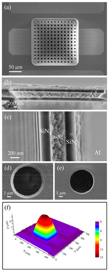 Caps with a size of 200 µm × 200 µm were fabricated on the central conductor of CPWs (Figure 2a). The morphology of the SiNx/a-Si/SiNx trilayer and the relevant interfaces were observed by scanning electron microscopy (SEM) in cross-sectional geometry, as shown in Figure 2b,c. The micrographs show the section of a cleaved hole, as clearly visible in the low magnification image in Figure 2b; therefore, the layers’ morphology is the native one (i.e., resulting from the etching process), and is not affected by the cleavage procedure. It is worth noting that the hole sidewalls are not vertical, and this is particularly evident for the a-Si film, forming a surface at about 50 degrees with the hole plane and exhibiting a very rough morphology. This morphology is probably the result of the granular structure of the a-Si film, while the SiNx layers appear compact and homogeneous (Figure 2c). Thickness uniformity of layers deposited on the Si wafer was checked and found homogeneous below 5%. Figure 2d shows a typical SEM view of a hole with a diameter of 7 µm, which was obtained in the barrel etcher. For comparison, the same hole obtained changing the barrel etcher with an ICP etcher is shown in Figure 2e. It is notable that the trilayer structure of the capping layer is more evident in the case of the hole etched in the barrel reactor, due to the inclined sidewalls, as already observed in the cross sectional analysis. Furthermore, the diameter of the barrel hole is about 30% larger than the ICP hole. Both these effects are due to the isotropic characteristic of the barrel etching. Fabricated caps show a concave shape with a height of ~15 µm (Figure 2f).