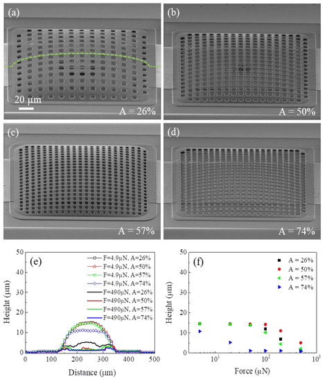 Linear profiles along the caps in Figure 3a–d were performed under the application of different stylus tip forces. Figure 3e shows the comparison between the scans along caps under the application of the lowest (4.9 µN) and the highest (490 µN) force values. In the case of the lowest force, the profile is approximately the same for caps with A < 57%, while a lowering and a flattening are observed for the cap with A = 74%. When the highest force value of 490 µN is applied, the caps tend to collapse on the CPW; that is, they bend up to touch the CPW, with possible evidence of residual sacrificial material. Consistent with SEM images, the collapse of the cap on the CPW is not complete for A = 26% and A = 50% since a feature of a few microns was observed in the central part of the cap. The height of this feature reduced from 5 µm to 2 µm as A increased from 26% to 50%. For greater values of A, the cap was completely collapsed on the central conductor of the CPW with no evidence of residual sacrificial material. In all cases, the cap results were stiffer at the anchoring points than in the internal region, as already observed in another study [10]. Figure 3f shows how the center of caps with the various A values deflects as a function of the stylus tip force. It is observable that the cap with A = 26% shows a deflection for forces greater than 100 µN. In particular, it deflects by ~30% under the application of 196 µN and even more when the applied force is increased, until the maximum deflection for F = 490 µN when the cap collapsed on the residual sacrificial material. With increasing A from 26% to 50%, the cap bends for F = 98 µN with a deflection of 2 µm. Flexibility further increases for the cap with A = 57%. The cap with A = 74% collapses on the CPW for a force as low as 49 µN, however no breakage is observed for forces up to 490 µN.
