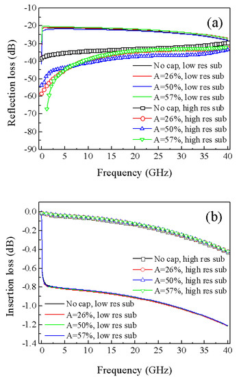 The insertion loss of the uncapped CPW on a low resistivity substrate decreased from around −0.8 dB to −1.2 dB with frequency (Figure 4b). When the high resistivity substrate was used, the insertion loss of the uncapped CPW improved, reducing from nearly zero to around −0.45 dB. For both substrates, no appreciable effects on the insertion loss were predicted to be induced by the presence of caps.