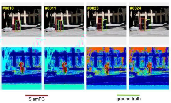 (top) Four frames (#0010, #0011, #0023, and #24) of SiamFC’s tracking failure in Human8 sequence; (bottom) histogram maps of each frame corresponding to first row (#0010, #0011, #0023, and #24), the red region in the map represents high score.