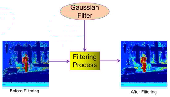 A Gaussian filter is essentially a low-pass filter that calculates image convolution and normal distribution. It can remove fine image details, and produce a very pure smoothing effect. According to our experiments, in our HKSiamFC tracker, a Gaussian filter with 9 × 9 kernel size could eliminate the bad influence from the isolated noise pixels very well, as shown in Figure 3.
