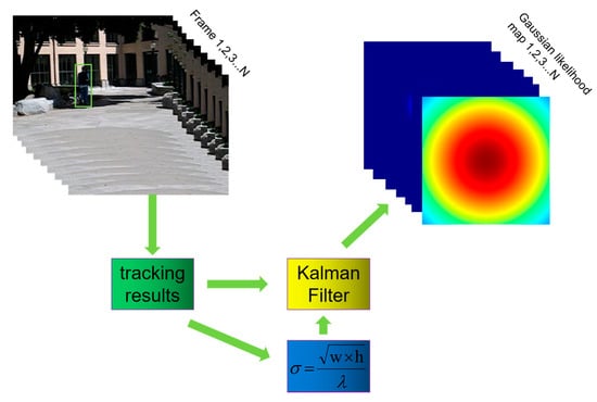 where w and h are the width and length of the target that are provided by the previous frame’s tracking result, respectively, while is a parameter. Figure 4 shows the workflow of Kalman model. This map shows the probability of each pixel on the image belonging to the target using trajectory information provided by the Kalman filter. So, utilizing it for element-wise multiplication with SiamFC’s score map can suppress background noise from the perspective of motion information.