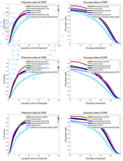 In this section, an ablation experiment was conducted on OTB dataset to test the correctness and effectiveness of each tracking component proposed in this paper. We adopted SiamFC and Staple as our baseline trackers because our tracker was designed on that basis. These two trackers are representative state-of-the-art trackers that are cited often by visual-tracking researchers. The codes of SiamFC and Staple were downloaded from the authors’ website without any changes. The parameters of the trained CNN used in the SiamFC tracker came from “2016-08-17.net.mat” on http://www.robots.ox.ac.uk/~luca/siamese-fc.html. What’s more, to test the function of the histogram model, the Kalman model and the template update strategy of our tracking framework, we also set another three baseline trackers: (1) HSiamFC (without K): this tracker is produced by removing the Kalman model from the HKSiamFC. (2) KSiamFC (without H): this tracker is produced by removing the histogram model from the HKSiamFC. (3) HKSiamFC (without template update): this tracker is produced by removing the template update process from HKSiamFC.