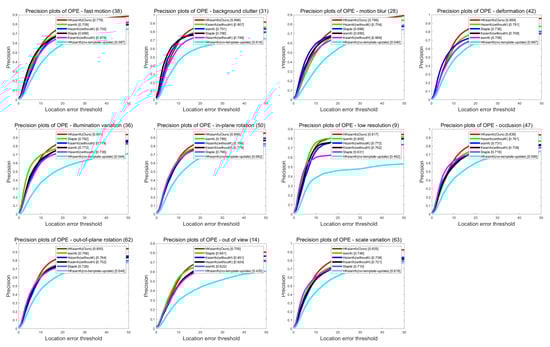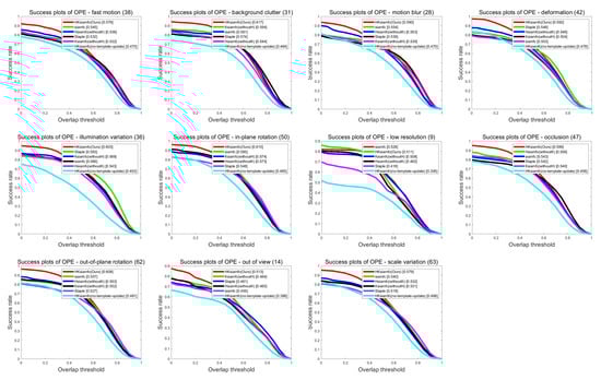 As was discussed above, image sequences in OTB are marked with 11 different labels that describe the tracking scenarios that each sequence contains. Each label represents one crucial factor that may influence tracker performance, i.e., scale variation (SV), low resolution (LR), illumination variation (IV), motion blur (MB), out-of-plane rotation (OPR), out of view (OV), background cluttered (BC), deformation (DEF), fast motion (FM), in-plane rotation (IPR), and occlusion (OCC). Evaluating tracker performance under each scenario could therefore further analyze the tracker’s characteristics and find its advantages and disadvantages. In this way, we can better optimize the tracking algorithm.