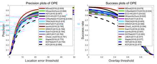 To further evaluate the performance of our HKSiamFC tracker, we selected 14 state-of-the-art trackers designed on the basis of different tracking strategies as our comparison objects. Those trackers were all representative, and have been cited by many visual-tracking researchers. Those trackers are: kernelized-correlation-filter (KCF) tracker [], multi-domain convolutional neural networks (MDNet) tracker [], fully-convolutional Siamese (SiamFC) tracker [], siamese network using triple loss (SiamFC_tri) tracker [], efficient convolution operators (ECO-HC) tracker [], context-aware deep feature compression with multiple Auto-encoders (TRACA) tracker [], correlation filter network using triple loss (CFNet2_tri) tracker [], cropping-inside residual fully-convolutional network (CIResNet-22FC) tracker [], Staple tracker [], spatially regularized discriminative correlation-filter (SRDCF) tracker [], background-aware correlation-filter (BACF) tracker [], discriminative correlation-filter network (DCFNet) tracker [], large-margin correlation-filter (LMCF) tracker [], hedged deep tracker (HDT) []. The selection of these trackers provided a horizontal comparison to comprehensively evaluate our HKSiamFC tracker. To be concise, we only listed the results of the precision and success plots on OTB100 because it contains all the sequences that OTB50 and OTB2013 have, so these results were persuasive enough.