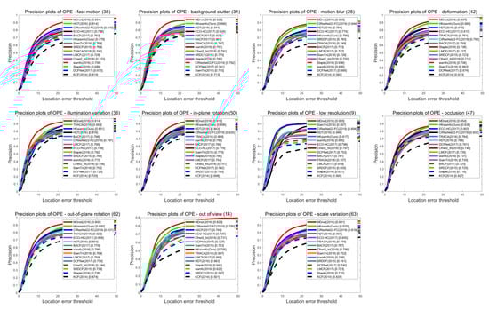Tracking result of 15 compared trackers in precision plot in 11 different scenarios. This picture is best viewed on high-resolution displays.