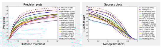 In our experiments, a uniform evaluation metric was adopted, put forward by the OTB and widely acknowledged in the community of visual tracking, namely, precision plot and success plot. These two plots are based on center location error (CLE) and intersection over union (IOU), respectively. The CLE compared the Euclidean distance between the center locations of the tracked result and the corresponding labeled ground-truth of each frame. Then, a threshold was set to determine whether tracking was successful. If Euclidean distance was smaller than the threshold, tracking was regarded as correct. Usually, different thresholds are set to more roundly evaluate trackers. The IOU is defined as