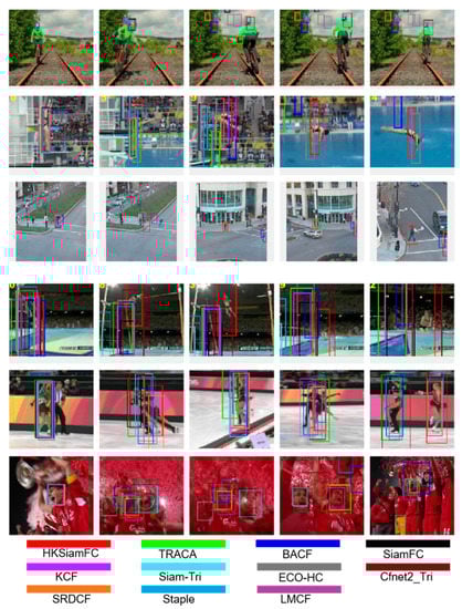In this section, we present the qualitative tracking results of 11 trackers listed above on several representative sequences in the OTB dataset. These 11 trackers were HKSiamFC and 10 other trackers selected from the comparison objects in Section 4.3, details of which are shown in Figure 11. The six rows of sequences (from top to bottom) are biker, diving, human3, jump, skating2-1, and soccer, respectively.