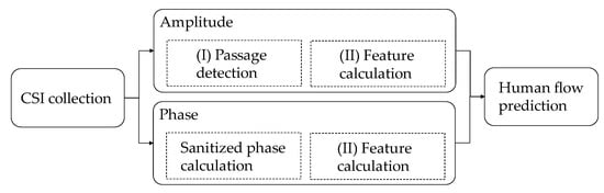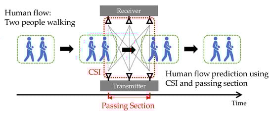 The purpose of the proposal is to predict a human flow, including activities, such as one person or two people walking or running, between transmitting and receiving antennas. The proposed system is composed of mainly three parts, as shown in Figure 2: (I) the passage detection of human flow, (II) the calculation of feature values, and (III) the human flow prediction. In the system, the sampling frequency for measuring CSI is set to 1 kHz [12]. In general, if the sampling frequency is low, it is difficult to follow a rapid motion.