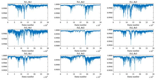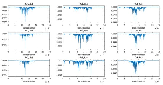 Figure 3 and Figure 4 show the maximum eigenvalue characteristics of CSI amplitude when the low pass filter is not applied and when the filter is applied, respectively. As shown in Figure 1, two people start walking in front of the antenna, cross it, and pass it. In the environment, there are three transmitting and three receiving antennas, i.e., nine transmission paths. When the filter is not applied, the noise is also included in the maximum eigenvalue characteristics, as shown in Figure 3, but as shown in Figure 4, it is clear that the noise is removed. The eigenvalue is lower than one where two people are passing between antennas.
