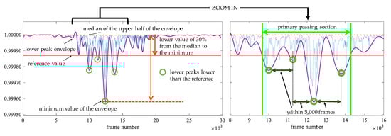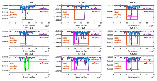 In the passage detection, we assume that only one human flow is passed during observation. We describe the explanation of the detection method using Figure 5 and Figure 6. Figure 5 shows the Tx1–Rx1 path in Figure 6. The blue line in Figure 5 is the maximum eigenvalue after the low pass filter, which is the same as Figure 4. Since the fluctuation of the maximum eigenvalue is large while a human flow is passing, we use the lower peak envelope of the maximum eigenvalue smoothed over 300 sample intervals (purple line in Figure 5). The reference value of the envelope (red line in Figure 5) to detect the flow is the lower value of 30% from the median of the upper half of the envelope (red dot line in Figure 5) to the minimum value. Next, the lower peaks, i.e., valley, that are lower than the reference value are selected (green circle in Figure 5). Among the selected lower peaks, the adjacent peaks within 5000 frames are extracted. The section of the lower peak envelope with less than the threshold including extracted lower peak is called a primary passing section (light green line in Figure 5). Finally, the final passing section is determined by comparing the primary passing section in each transmission path with the median values of the start and end points in the primary passing sections of all transmission paths. The final passing section of the start and end points in each transmission path is the minimum to maximum frame number among the primary passing section and the median values. The ranges of green and pink lines in Figure 6 show the primary passing sections in each path and the median of the primary passing section in all paths, respectively. The range of the brown line is the final passing section in each path. The reason why the final passing section is applied is that the primary passing section may not be appropriate depending on the transmission path. For example, the primary passing section in the Tx2–Rx3 path is very narrow and cannot be appropriately detected. To address this problem, we have to apply the final passing section instead of the primary passing section.