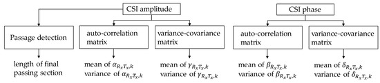 In addition to the two types of eigenvalues, and , the maximum eigenvalues derived from the variance–covariance matrix composed of the CSI amplitude or the phase CSI phase in Equations (10) and (11) are used. This method to create the maximum eigenvalues is the same as that of [11].