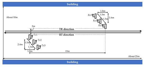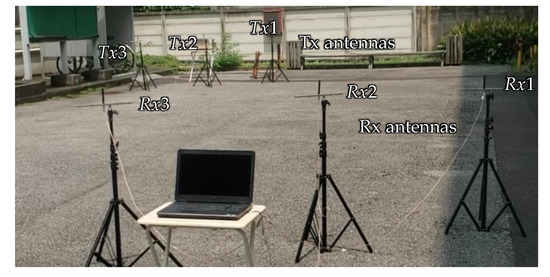 We experimented on an outdoor road of our campus, as shown in Figure 8. The antennas’ deployment is shown in Figure 9. The size of the experimental area is about 10 × 25 m. The distance between the buildings on both sides is about 10 m. In the center of Tokyo, roads are narrow, and buildings are on both sides. Our experiment environment is similar to a road in the center of Tokyo. Note that the antenna cannot be placed diagonally in a real situation.
