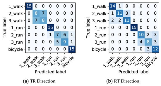 At first, we analyzed the performance when only the lengths of the final passing section were used. The prediction accuracies for TR and RT directions are 0.733 and 0.771, respectively. The definition of prediction accuracy is the ratio of the number of correct predictions and the total number of predictions. In the case of TR direction, the number of correct predictions was 77, and the total number of predictions was 15 × 7 = 105. Thus, the prediction accuracy is 77/105 = 0.733. In the case of RT direction, the number of correct predictions was 81, and the total number of predictions was 15 × 7 = 105. Thus, the prediction accuracy is 81/105 = 0.771. The confusion matrix for TR and RT directions is shown in Figure 10. For example, “1_walk” denotes one person walking. The prediction error occurs when the difference in the length of the final passing is small, such as two and three people walking. There is a similar trend between TR and RT directions.