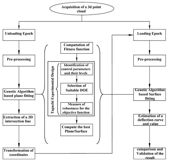 This study presents an effective algorithm for measuring the structural deflection by enriching previous studies. Improvements are made according to the following five main steps of the procedure listed; the acquisition of TLS data for the loading and unloading scenarios, fitting of a plane for the point cloud acquired during the unloading scenario using a robust genetic algorithm, transformation of the scanner coordinates into local structural coordinates, curve fitting of transformed data for the loading case, and eventually, estimation and comparison of deflection between contact sensors. Furthermore, our research illustrates the performance of the proposed procedure with a validating experiment in which deflection measurements are simulated based on the loading scenario.