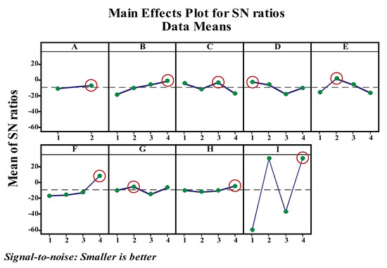 Among the various preferences for experiment design, a robust design is identified using the signal-to-noise ratio (SNR). This is because the higher values SNR identify the control settings that minimize the effects of the noise factors. Basically, the Taguchi design of experiment is used for two optimization processes: (a) use the signal-to-noise ratio to identify those control factors that reduce variability. (b) identify control factors that shift the mean to the target and have a small or no effect on the signal-to-noise ratio [45]. A SNR is suggested by Taguchi for cases in which the response standard deviation is related to the mean. The purpose of SNR in Taguchi’s approach to robust parameter design is to provide an easy-to-use performance criterion that takes the process mean and variance into account. Among the numerous SNR values, “the smaller-the-better” philosophy used in this study, as shown in Equation (5).