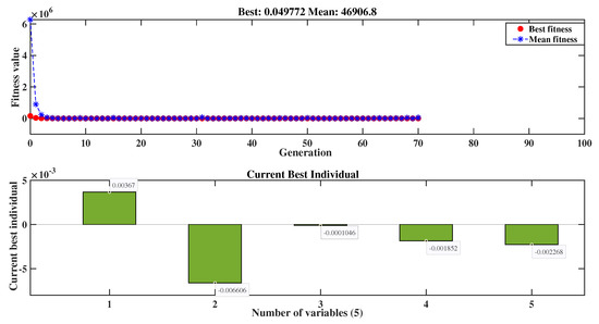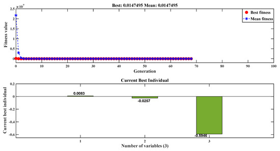 The principle of least squares sum in the curve fitting problem, which minimizes the difference between the data and model of the output, is useful. However, in this study, the basic principle of least squares is incorporated with a notable stochastic optimization known as a genetic algorithm for the purpose of decreasing the difference between the data and model [38]. Consequently, this is particularly useful if we utilize an error metric in terms of the functional form and optimize it using a GA. Holland and his student stated that GA works with an encoding of the individuals throughout the algorithm [36]. Originally, they constructed a GA based on binary numbers. Once we have fixed the number of chromosomes in the population, the basic algorithm operators (Selection, Crossover, and Mutation) start to conduct iteratively until it converges to optimal solutions. Currently, all these complication and processes are simplified using different platforms. Among them, the global optimization toolbox in MATLAB software is utilized for our studies. The essential parameters for running the GA in this study are [37]: