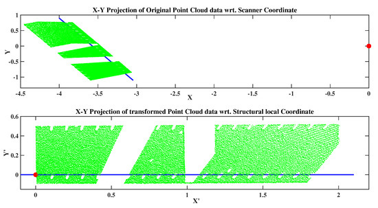 Now, it is possible to position at least one axis of the new coordinate system, the x-axis in our case, along the intersection line described in the above figure. From Figure 5, the difference between points and Q gives us the vector which lies on the new x-axis, called X. Before performing the rotation, we should determine the geometric correlation between the vector Q and the old basis (X,Y,Z) after translating of point O to point . Figure 10 shows the resulting point cloud data after performing the required transformation. This information is helpful in quantifying the deflection of a structure by applying the transformation matrix to the acquired point cloud data during the loading scenario.
