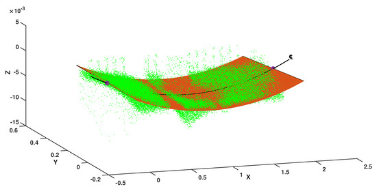 After obtaining the coordinate transformation, it is possible to consider changes in the shape of an object formed by the point cloud that are equivalent to the actual object. In the last phase of the proposed algorithm, we fit the curved surface as a 2nd degree curve on the longitudinal axis and a linear curve on the transverse axis for each individual loading scenario using the transformed point clouds. The GA fitness function appears more complicated than the previous one since the error metric formulation is now considered as a two degree curve caused by loading. This can be described by the following Equation (13):