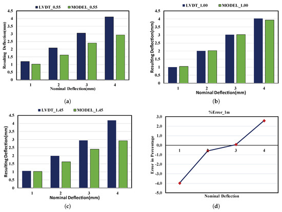 As a result, the proposed approach of representing the deflection shape in terms of a parabolic curve may only accurately capture the deflection formed throughout the whole span length except for around the mid-span. For emphasis, in the case of edge LVDTs in Figure 13a,c, the resulting deflection from the LVDT in each load scenario is almost the same as with the nominal one. However, this situation is incompatible with the proposed model since we are dealing with a deflection curve considered as a 2nd degree polynomial curve. It is obvious that if we consider a deflection curve as explained above while keeping the max deflection (at the center) equal to the nominal deflection, the deflection at the edge LVDT is less than the nominal one. Consequently, the proposed methodology is validated only for the middle LVDT sensor. As shown in Figure 13d, the proposed algorithm is accurate and effective for nominal deflections of 2 and 3 mm since the error is between . For the case of nominal deflections of 1 and 4 mm, the error increases to and , respectively.