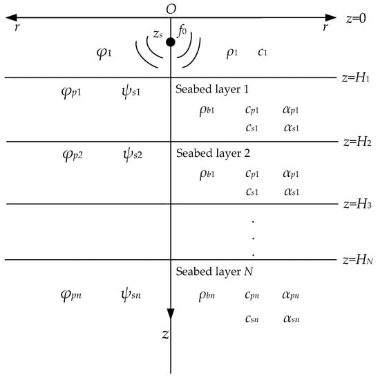 The S-wave of the seabed has a significant impact on the propagation of low-frequency acoustic signals in the shallow sea environments. The environment model in this study is developed based on Pekeris waveguide [], and the seabed is regarded as an N-layered elastic medium. A schematic diagram of the waveguide model is shown in Figure 2. The z-axis indicates the depth of the sea, and the r-axis represents the propagation direction of acoustic signals. As shown in the figure, φ1, φpn, and ψsn are the displacement potential function in the water column, P-wave displacement potential function, and S-wave displacement potential function in the layered seabed, respectively. ρ1 and c1 are the density and sound speed in the water column. ρbn, cpn, and csn are the density, compression wave (P-wave) speed, and shear wave (S-wave) speed, respectively, of the n layer of seabed, αpn and αsn represent the attenuation of P-wave and S-wave, respectively; these five parameters in each layer of seabed are the expected inversion objects in this study. Moreover, zs is the depth of the point acoustic source, z = 0 and z = H are set as the sea surface and seabed in the model.