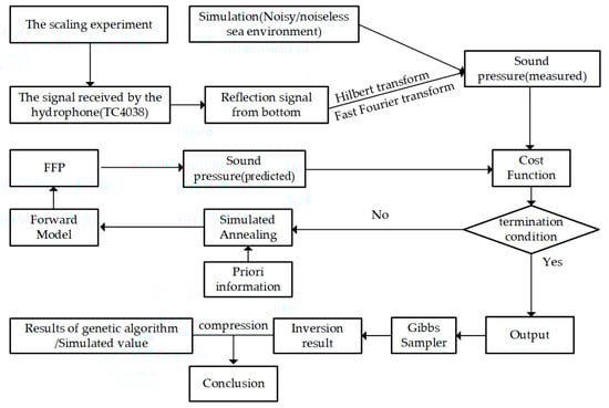 As can be seen from Figure 3, in the research, the simulated annealing (SA) is used to optimize the of expecting geoacoustic parameters from Equation (23). The Gibbs sampler (GS) algorithm is applied to compute the PPD moments as defined in Equations (10)–(13), and the sample model is accumulated by SA at temperature T = 1 []. In Section 5, the genetic algorithm (GA) is also used to optimize the , which is regarded as a compression to verify the inversion method proposed in this paper. For SA settings, the starting T0 = 100, cooling rate ξ = 0.99, the number of samples n = 10000, and the type of perturbation is non-uniform. For GA settings, the population of each generation is pop = 1000, the type of coding is binary coding, the maximum generation is 100, the type of selection is roulette wheel selection, the cross-over rate is 0.95, and the mutation rate is 0.05. GS settings corresponded to the SA settings. A block diagram of the research is shown in Figure 3.