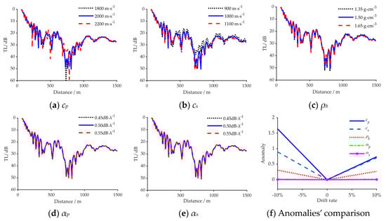 Figure 4 reveals the comparison results of the TL under different geo-acoustic parameters in the simulation. Figure 4a to Figure 3e show the influence of cp, cs, ρb, αp, and αs on acoustic propagation separately. The changing values of each parameter were set to the simulation true value deviation ±10%; when one of the above parameters changed, the other parameters remained fixed. In Figure 4a–e, the solid blue line represents the calculation results under the simulated true values, where the dotted black line and the dashed red line indicate the calculation results under the changing values. Figure 4f revealed the comparison of TLs’ anomalies when the value of each parameter was changed, and the change bounds were set between −10% to +10% of the true value [].