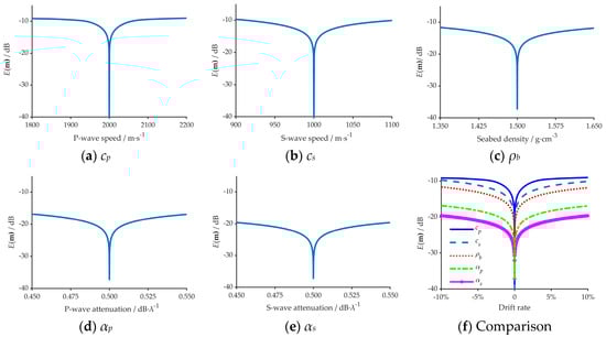 The sensitivity of the cost function (E(m)) for the five geoacoustic parameters. (a) to (e)corresponds to the cp, cs, ρb, αp, and αs, respectively. (f) corresponds to the comparison of five parameter’s influence on E(m).