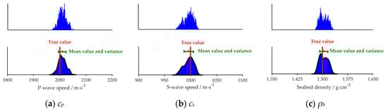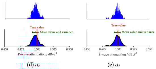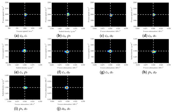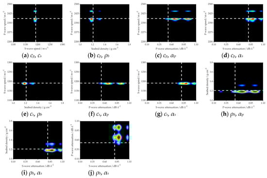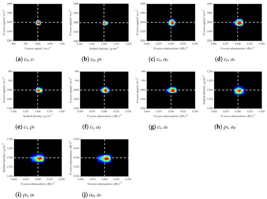 Figure 15 represents the 2D marginal of the PPDs, where the dashed white line indicates the GA inversion result of each parameter, and the values of the variance represent the magnitude of the uncertainty. As shown in Figure 15a,b,e, the result of GA is near or at the highest probability. While in the Figure 15c,d,f–j, we can see that there is a little deviation between those two kinds of inversion methods, but for each parameter, the result of GA is within the margin of error. The density of the plastic plates was known in the measurement experiment, which was 1.2 g·cm−3. It is very near to the inversion value, which proves the viability of the inversion results. Thus, it is concluded that: cp, cs, and ρb are more sensitive and have fewer uncertainties to acoustic pressure than αp and αs.