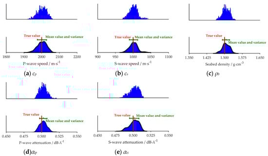 For the parameters cp, cs and ρb, the inversion results are similar in the two different marine environments, such as Figure 6a–c, Figure 7a–c, Figure 8a–c,e,f and Figure 9a–c,e,f. It is summarized that noise has less effect on the inversion results of sensitive parameters.