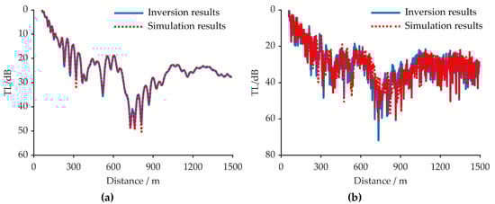 The verification of simulation results. The solid blue line means the Transmission Loss (TL) measured in the simulation and the dashed red line represents the TL simulated by inversion result. (a) the comparison of TL in the noiseless sea environment; (b) the comparison of TL in the noisy sea environment.