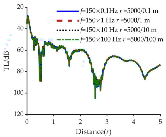 Figure 11 displays the transmission losses under four scaling conditions, namely N = 0.1, 1, 10, 100. The corresponding sound frequency and water depth are 150 × 0.1 Hz, 150 × 1 Hz, 150 × 10 Hz, 150 × 100 Hz, and 100/0.1 m, 100/1 m, 100/10 m and 100/100 m, respectively. The acoustic source depth zs and receive depth zr are 20/0.1 m, 20/1 m, 20/10 m, 20/100 m and 10/0.1 m, 10/1 m, 10/10 m, 10/100 m respectively. The values of various acoustic parameters are set to be the same as the true value in Section 4.