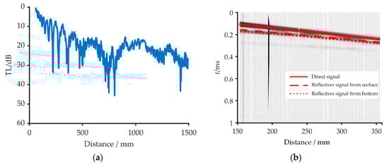 (a) The TL measured in the experiment; (b) The arrival time of the signal. The red line represents the arrival time of the direct signal, the dashed red line means the arrival time of surface reflection signal, and the dotted red line means the arrival time of the bottom reflection signal.