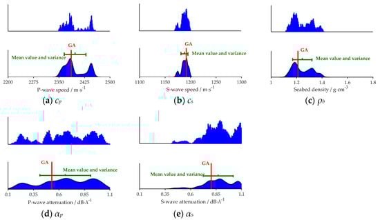 Figure 14 shows the PPDs of the five geoacoustic parameters. The vertical axis represents the probability, and GA means the inversion result of GA indicated by the red line. The mean value and variance of inversion results are indicated by the green segment in which the mean value is shown at the middle of the segment. The length of the green segment reflects the variance of each parameter. We can easily see from Figure 14 that different parameters have different sensitivities.