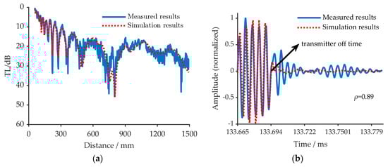 To verify the effectiveness of the inversion method, two different approaches are used as shown in Figure 16a,b. Figure 16a shows the comparison of the TLs obtained through measurement and simulation. As can be seen from Figure 16a, the measurement results are consistent with the simulation results. Figure 16b represents the signal amplitude of the measurement and simulation results in the time domain. Here, the two kinds of results showed a very high correlation, which reaches 0.89 when the effect of the transmitter, after it is off, is not considered. The after off effects of the transmitter are shown in Figure 16b. Thus, the approaches used here prove that the inversion results are credible.
