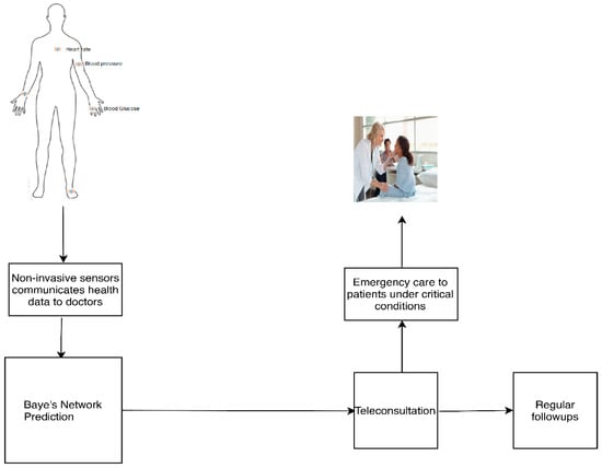 A patient wearing non-invasive sensors sends health data to remote healthcare centers for teleconsultation. The doctors examine the data at the healthcare centers and check whether the patient needs emergency care or teleconsultation through a Bayes network model for telemedicine. According to the output, teleconsultation or point of emergency care is given to the patient. Figure 1 shows the schematic representation of the telemedicine set-up.
